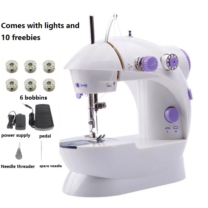 Package Contents: 1 x Mini Sewing Machine, 1 x Foot Pedal, 1 x Needle-threading Device, 1 x Threading Needle, 2 x Bobbin with Thread, 2 x Bobbin without Thread, 1 x Adapter, 1 x English User Manual